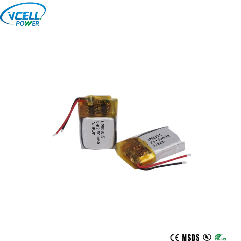1. 3,7V 501015 50mAh mini lithium polymer batteri, der bruger højkvalitets separatorer og tætningsprocesser, sikkert at bruge